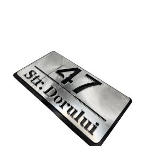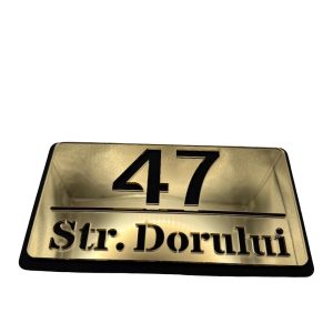 Plăcuță premium realizată din plexiglas rezistent cu finisaj prin laser, inscripționată cu numărul casei și adresa – un detaliu elegant pentru locuința ta.
