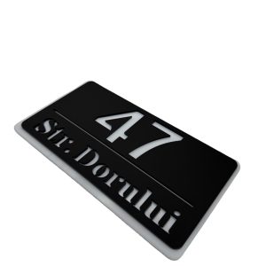 Plăcuță premium realizată din plexiglas rezistent cu finisaj prin laser, inscripționată cu numărul casei și adresa – un detaliu elegant pentru locuința ta.